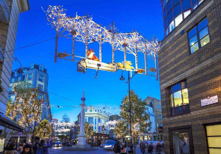 Tucked between Covent Garden and Soho lies Seven Dials; a constellation of seven streets converging upon a sundial pillar that seems to mark not just time, but taste. During Christmas, this enclave transforms into a miniature village of light, its cobbled lanes strung with warm gold garlands and the scent of mince pies floating through the air.